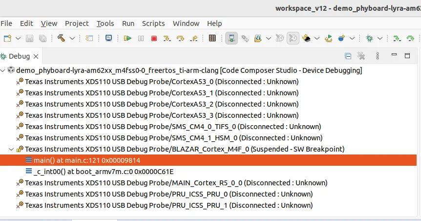 CCS will initialize the system. Once initialization is complete, the debug session will automatically pause at the first breakpoint in the