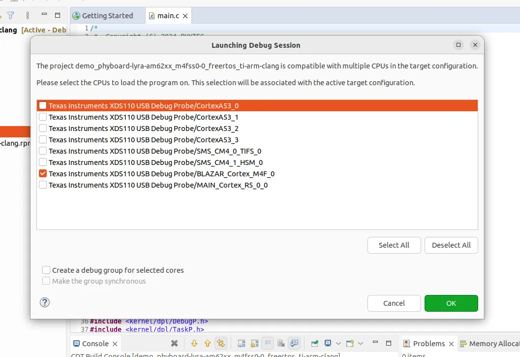 In the pop-up window, select only the BLAZAR_Cortex_M4F_0 CPU, and deselect all other cores.