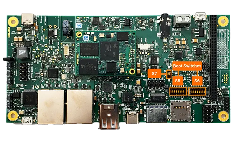 The phyCORE-AM62x development kit is configured to boot from an SD Card slot by default and basic steps for performing this and establishing serial communication are outlined in the Quickstart. Boot switch (aka DIP switches) settings determine the location and method the boot ROM loads the first stage bootloader into memory before executing it.