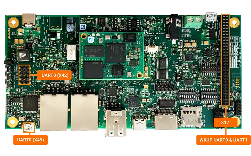 By default, the phyBOARD-Lyra AM62x is configured to use UART0 for a Linux console input and output. The UART0 signal is available through a micro-USB connector X49 via a UART to USB bridge. PHYTEC recommends allocating UART0 for console access on custom designs. You can see all available UART interfaces in the images and tables below. To learn more information about the phyCORE-AM62x UART interface, please see sections 7.5 and 11.3 in the Hardware Manual.