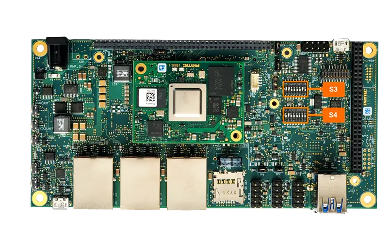The phyCORE-AM64x development kit supports booting from many different interfaces. By default, the developement kit is set to boot from the micro-SD card. To change the boot device, DIP switches S3 and S4 can be used. Boot switches should be changed with power off.