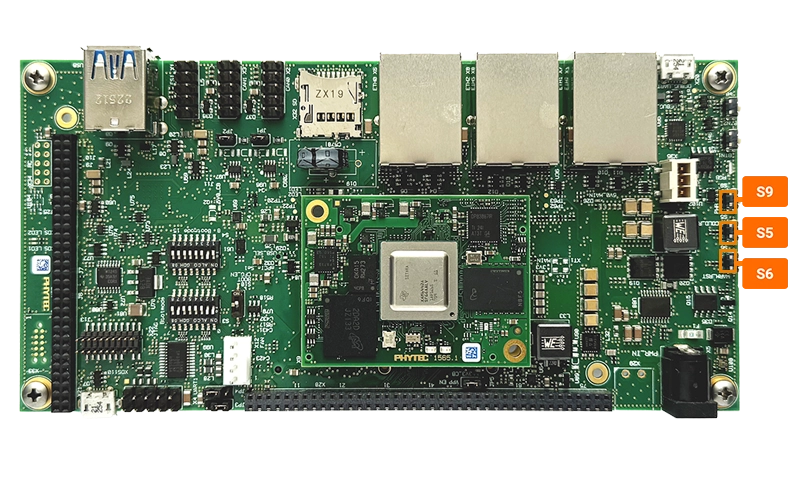 The phyCORE-AM64x development kit is provided a selection of buttons to perform power related functions. To learn more information about the phyCORE-AM64x reset interfaces, please see section 5.3 in the Hardware Manual.