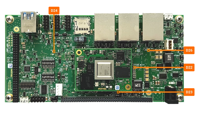 The phyCORE-AM64x Carrier Board has three green LEDs and one red LED which indicates the presence of power on the various supply rails available. These LEDs are not user programmable and are present for hardware debugging purposes only.