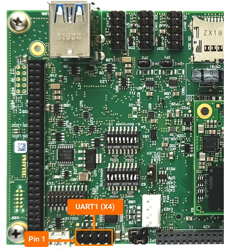 Connect the DB9 Male 2x5 to RS232 Female Cable (Included in the development kit) to the X4 connector (red line indicates Pin 1)