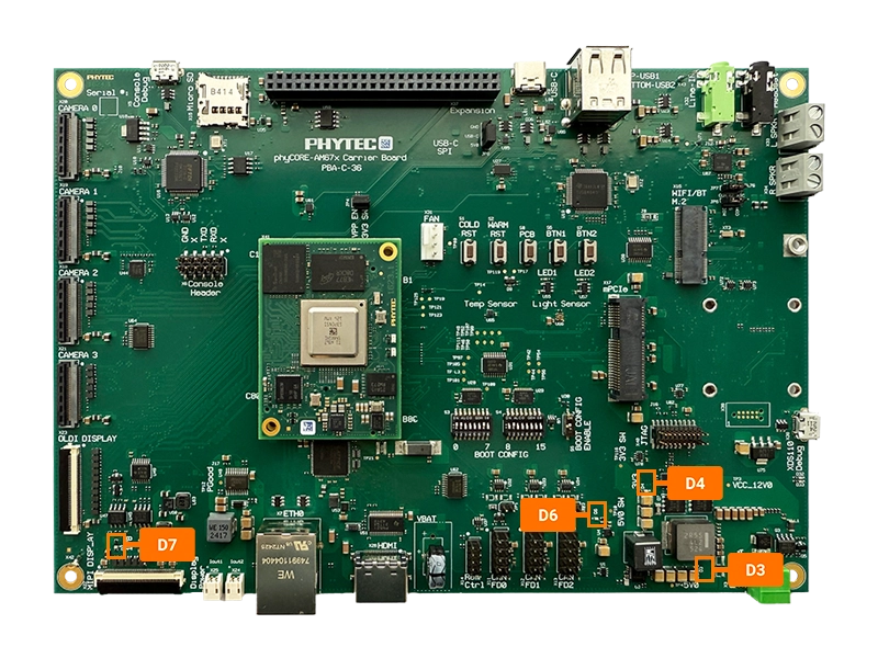 The phyCORE-AM67x Carrier Board has four green LEDs which indicate the presence of power on the various supply rails available. These LEDs are not user programmable and are present for hardware debugging purposes only.