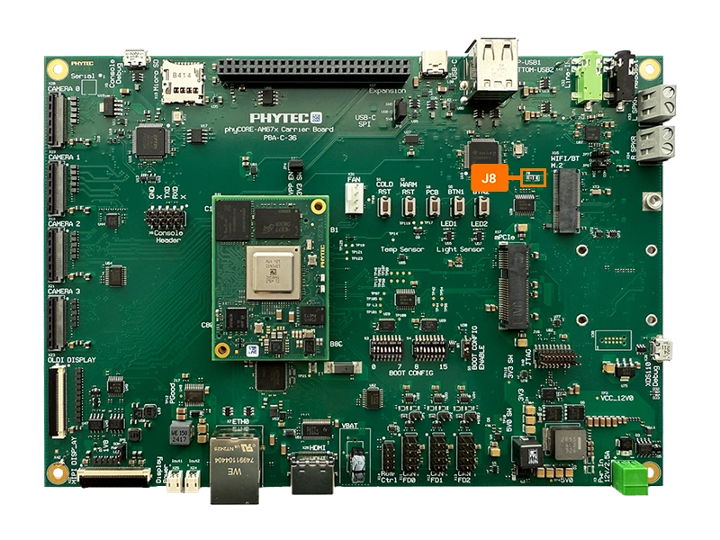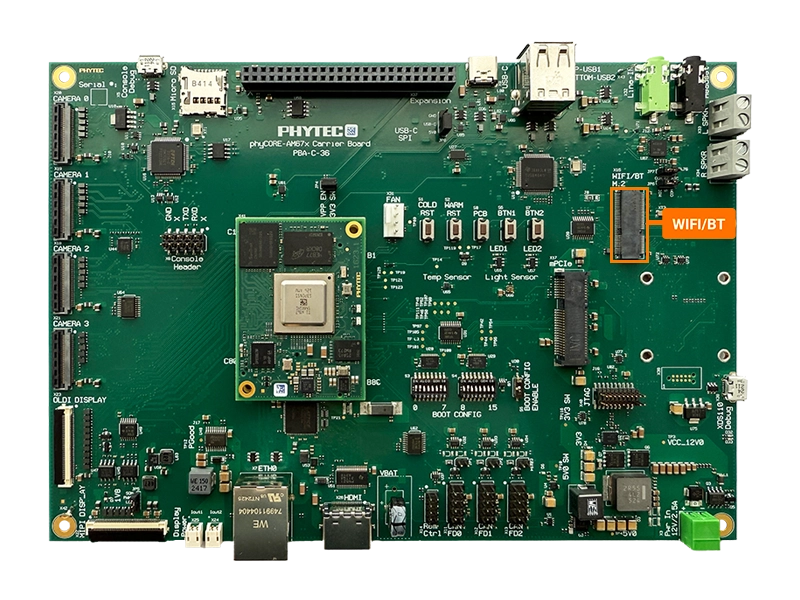 The phyBOARD-Rigel AM67x supports external WiFi modules via the M.2 connector located on the bottom of the development kit carrier board, at X16. For more information on the M.2 connector on the phyCORE-AM67x development kit, please see the Hardware Manual.