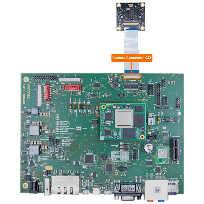 With the board powered off, connect the phyCAM-P module to the camera connector (X33) on the carrier board.