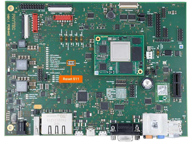 The phyCORE-i.MX8X development kit is provides a reset switch (S11) to reboot the SOM without power cycling the kit.