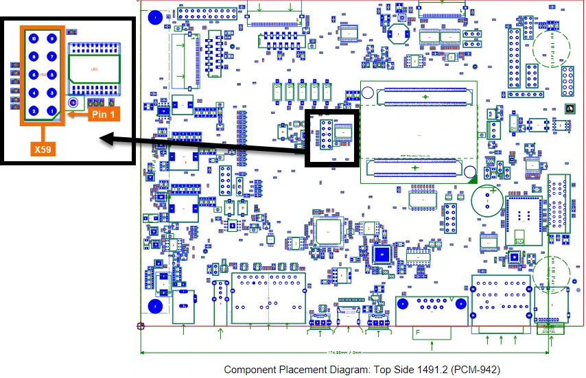Please note that the PCB version 1491.1 has a different location for the X59 header. In more recent revisions of the carrier board (1491.2) the header was relocated to be closer to the center of the board.