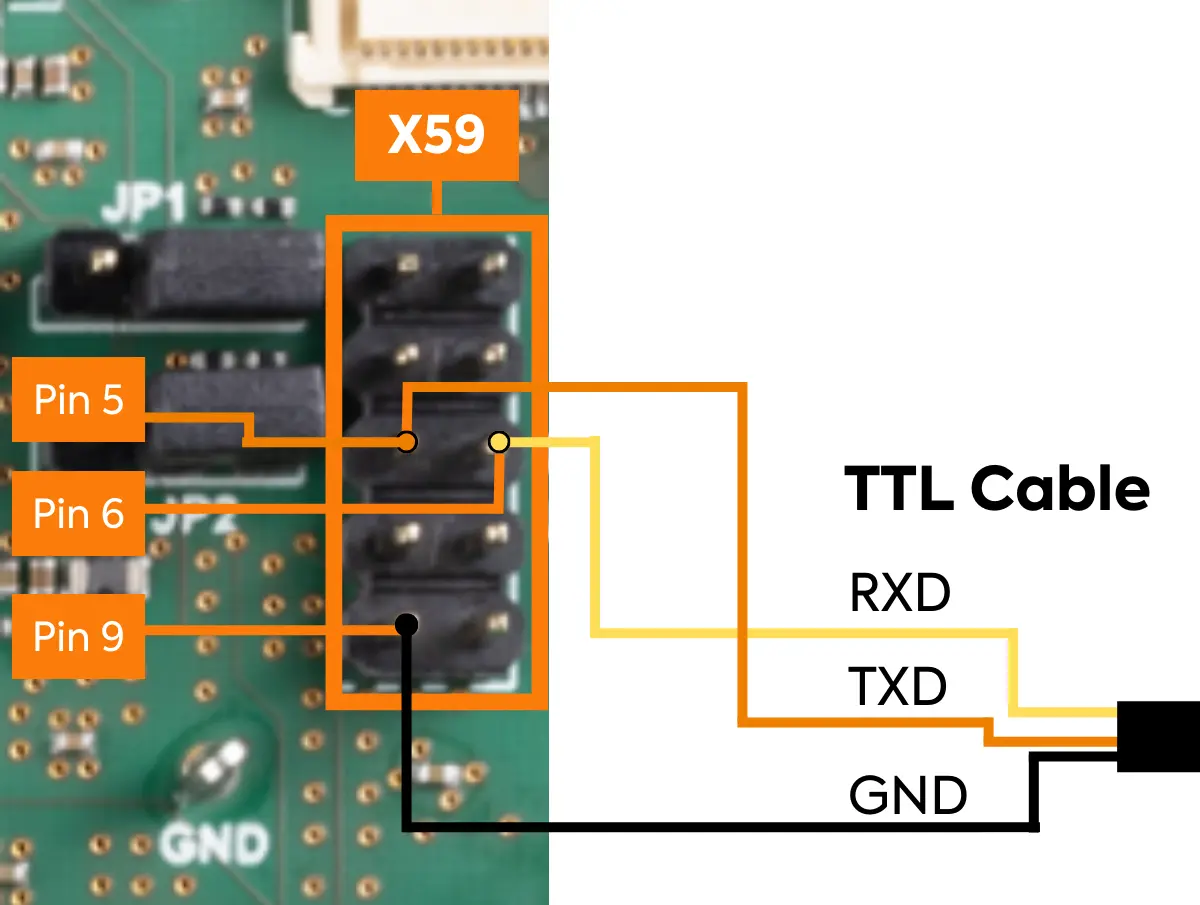 Using female to female jumper wires, connect between the pins of connector X59 and the RS-232 to USB adapter cable using the table and images below. Connect the other end of the RS-232 cable to your host PC.